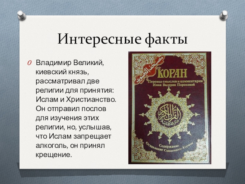 Владимир Великий, киевский князь, рассматривал две религии для принятия: Ислам