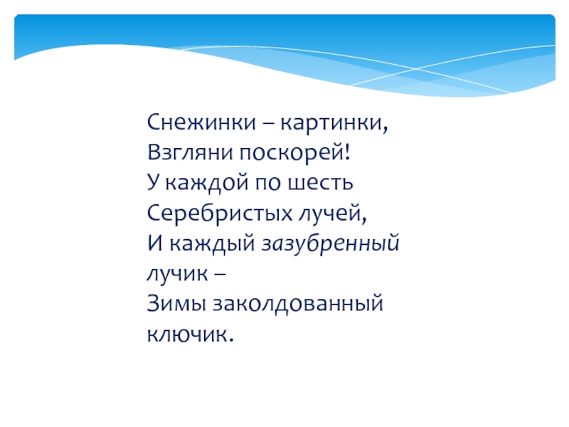 Снежинки – картинки,Взгляни поскорей!У каждой по шестьСеребристых лучей,И каждый зазубренный лучик –Зимы заколдованный ключик.