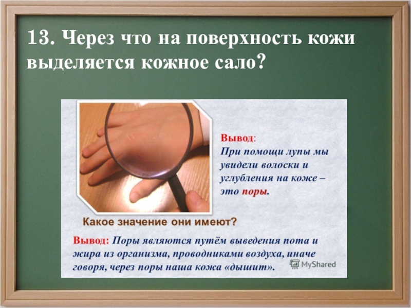 Слайд 1413. Через что на поверхность кожи выделяется кожное сало?