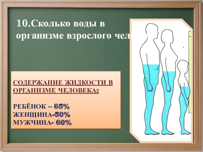 СОДЕРЖАНИЕ ЖИДКОСТИ В ОРГАНИЗМЕ ЧЕЛОВЕКА:РЕБЁНОК – 65%ЖЕНЩИНА-50%МУЖЧИНА- 60%10.Сколько воды в организме взрослого человека?