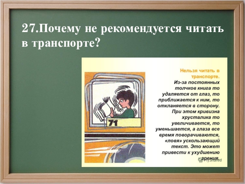 Слайд 2827.Почему не рекомендуется читать в транспорте?