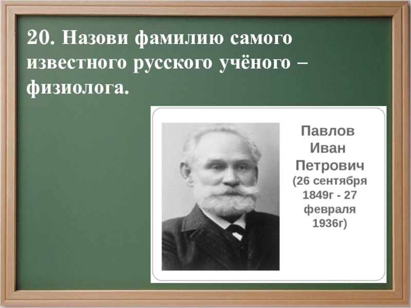 Слайд 2120. Назови фамилию самого известного русского учёного – физиолога.