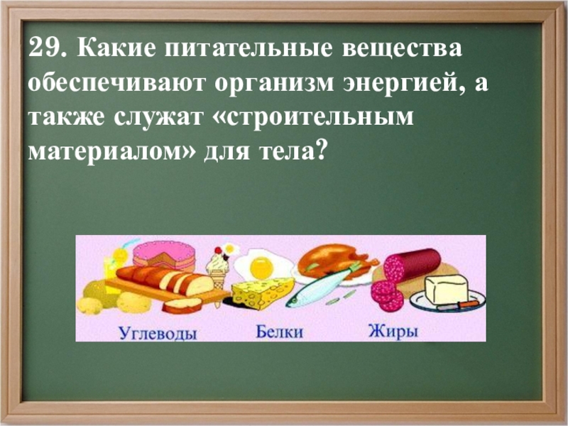 Слайд 3029. Какие питательные вещества обеспечивают организм энергией, а также служат «строительным