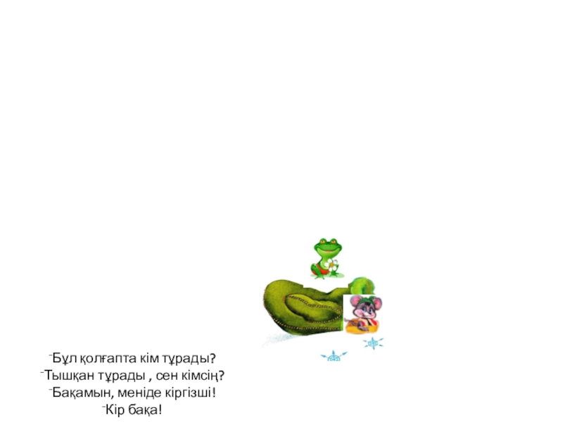 Бұл қолғапта кім тұрады?Тышқан тұрады , сен кімсің?Бақамын, меніде кіргізші!Кір бақа!