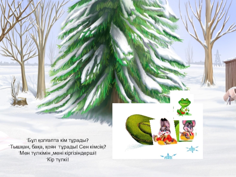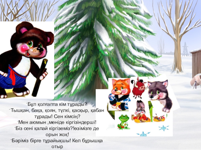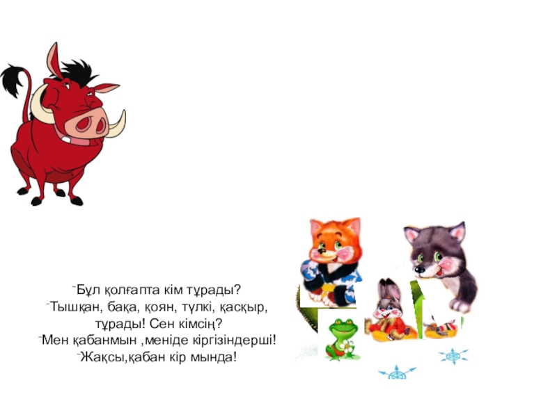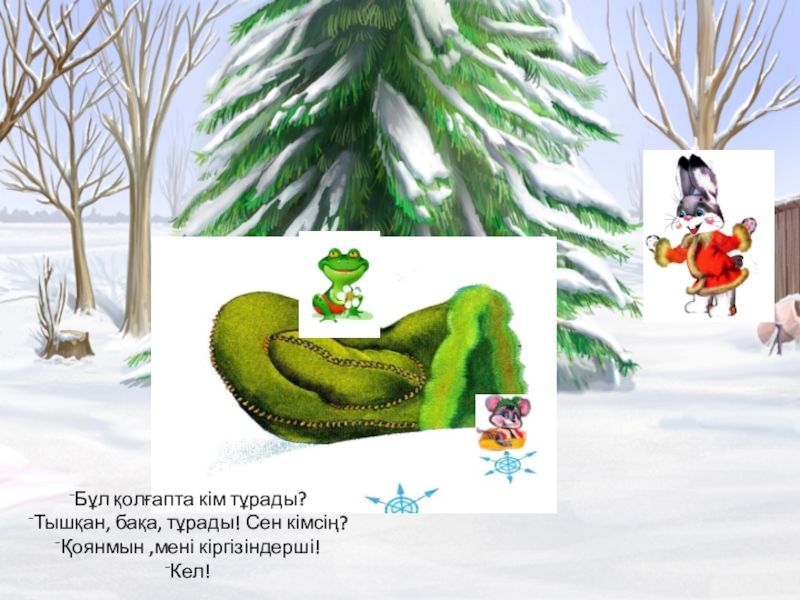 Бұл қолғапта кім тұрады?Тышқан, бақа, тұрады! Сен кімсің? Қоянмын ,мені кіргізіндерші!Кел!