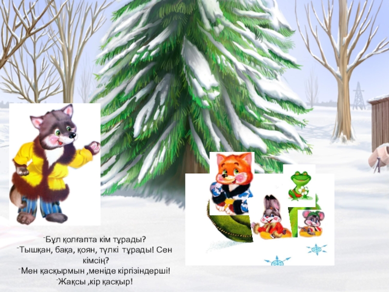 Бұл қолғапта кім тұрады?Тышқан, бақа, қоян, түлкі тұрады! Сен кімсің? Мен қасқырмын ,меніде кіргізіндерші!Жақсы ,кір қасқыр!