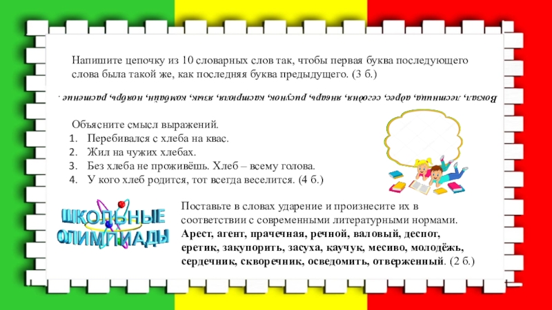 Гора луковая. Мир Древней Греции. Давайте жить в тире. Трубка пира. Глухое сено. Дом отечества. Игра не стоит встреч. Медвежья заслуга. (3 б.)