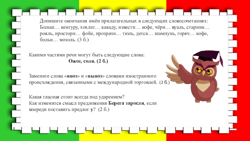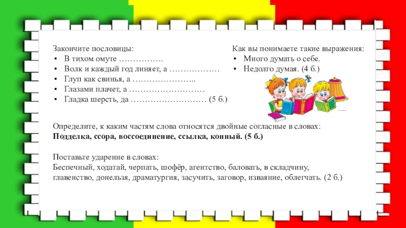 Завидно, камбала, квартал, дожил, красивее, гусеница, жаворонок, задал, статуя, звонит, столяр, щавель. (3 б.)