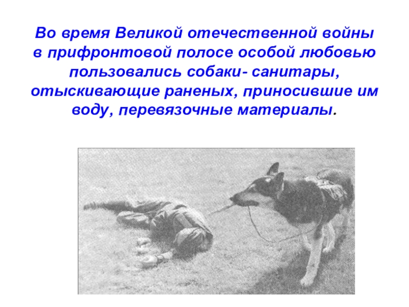 собаки- санитары, отыскивающие раненых, приносившие им воду, перевязочные материалы.