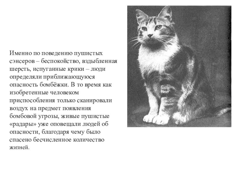 – люди определяли приближающуюся опасность бомбёжки. В то время как изобретенные человеком приспособления только сканировали воздух на предмет появления бомбовой угрозы, живые пушистые «радары» уже оповещали людей об опасности, благодаря чему было спасено бесчисленное количество жизней.