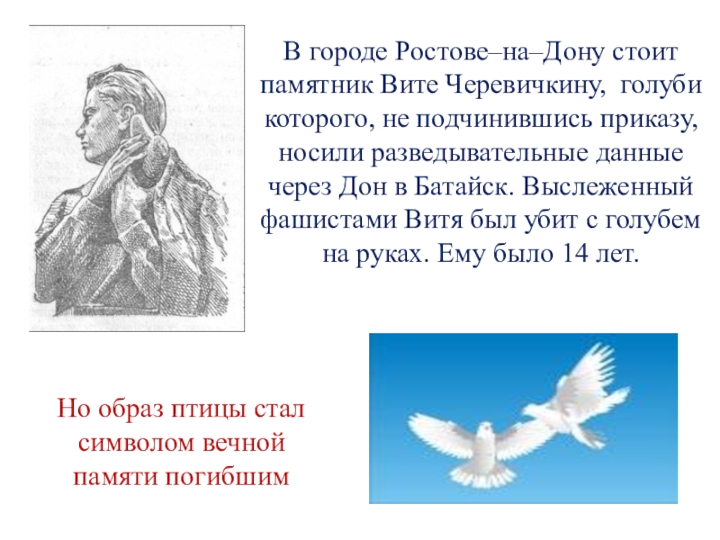 приказу, носили разведывательные данные через Дон в Батайск. Выслеженный фашистами Витя был убит с голубем на руках. Ему было 14 лет.