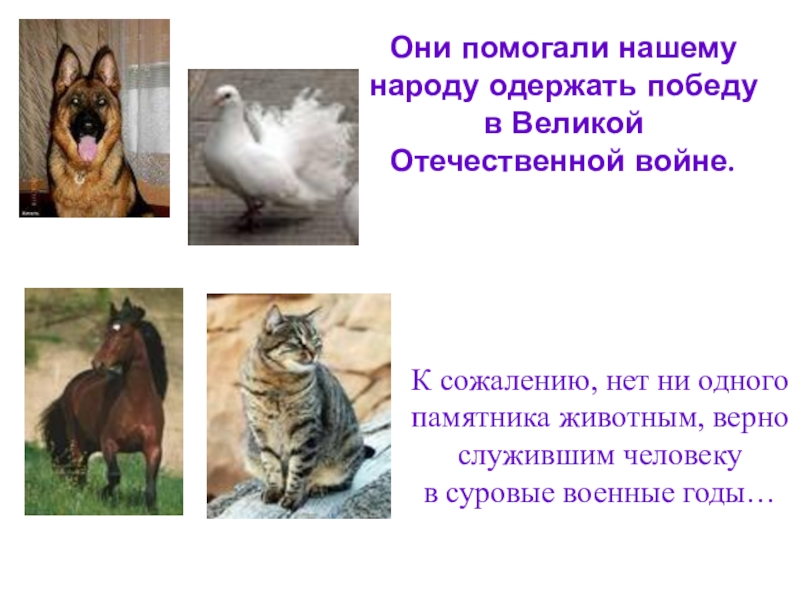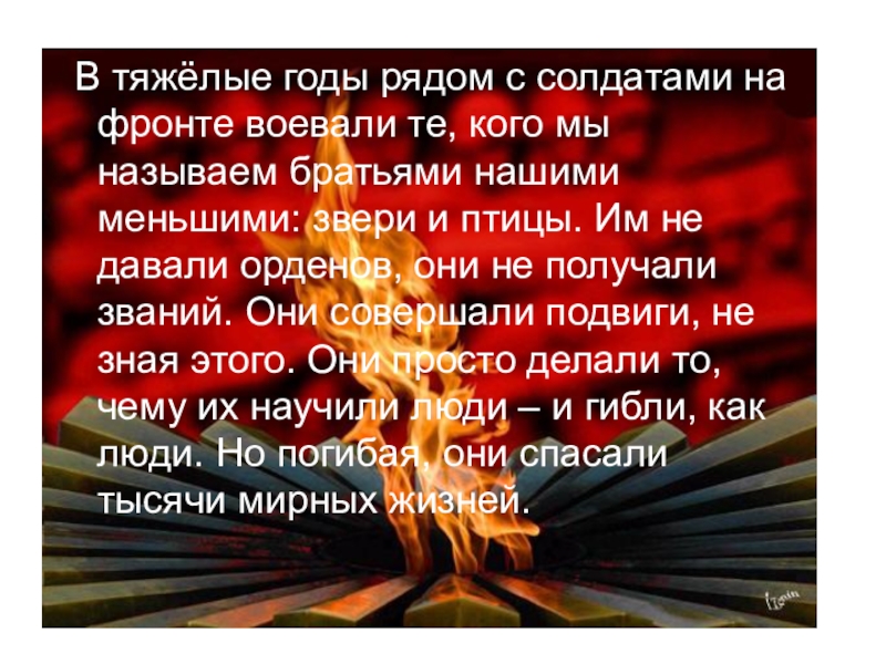 кого мы называем братьями нашими меньшими: звери и птицы. Им не давали орденов, они не получали званий. Они совершали подвиги, не зная этого. Они просто делали то, чему их научили люди – и гибли, как люди. Но погибая, они спасали тысячи мирных жизней.