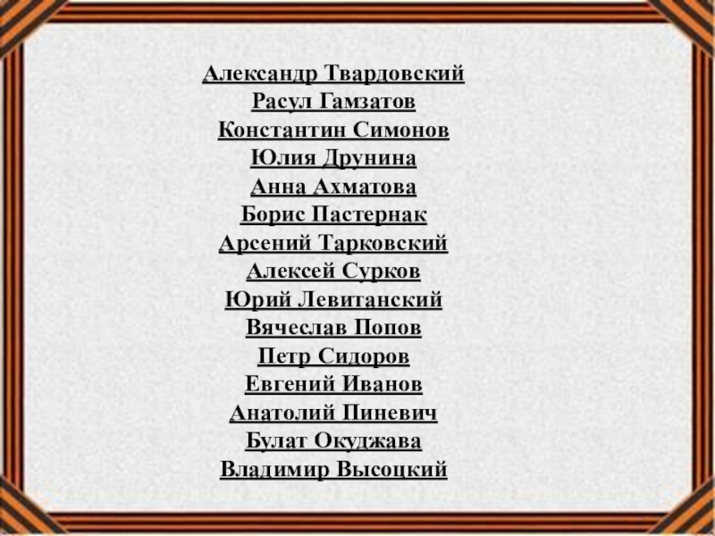 Александр ТвардовскийРасул ГамзатовКонстантин СимоновЮлия ДрунинаАнна АхматоваБорис ПастернакАрсений ТарковскийАлексей СурковЮрий ЛевитанскийВячеслав ПоповПетр СидоровЕвгений ИвановАнатолий ПиневичБулат ОкуджаваВладимир Высоцкий