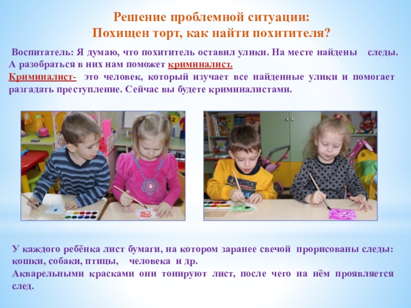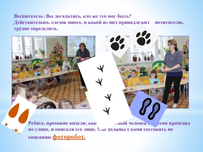 У каждого ребёнка лист бумаги, на котором заранее свечой прорисованы следы: кошки, собаки, птицы, человека и др.