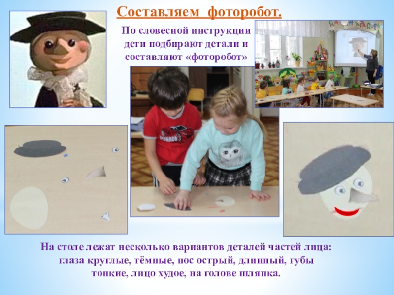 По словесной инструкции дети подбирают детали и составляют «фоторобот»