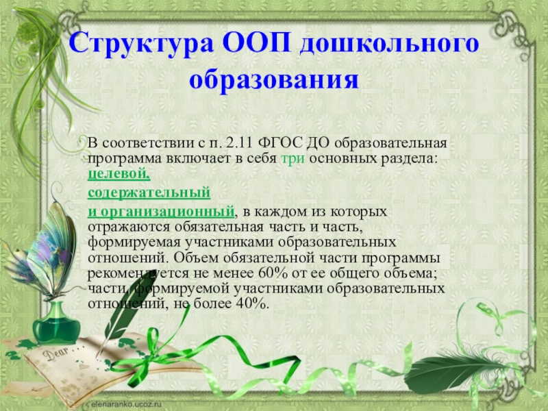 и организационный, в каждом из которых отражаются обязательная часть и часть, формируемая участниками образовательных отношений. Объем обязательной части программы рекомендуется не менее 60% от ее общего объема; части, формируемой участниками образовательных отношений, не более 40%.
