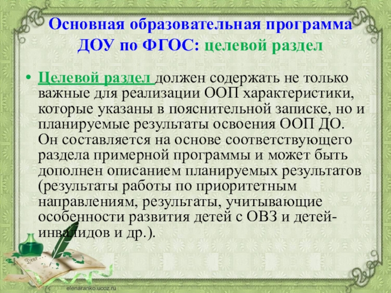 только важные для реализации ООП характеристики, которые указаны в пояснительной записке, но и планируемые результаты освоения ООП ДО. Он составляется на основе соответствующего раздела примерной программы и может быть дополнен описанием планируемых результатов (результаты работы по приоритетным направлениям, результаты, учитывающие особенности развития детей с ОВЗ и детей-инвалидов и др.).
