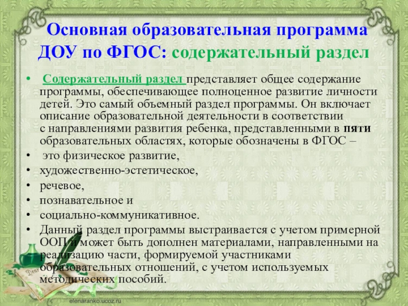Слайд 5 Основная образовательная программа ДОУ по ФГОС: содержательный раздел