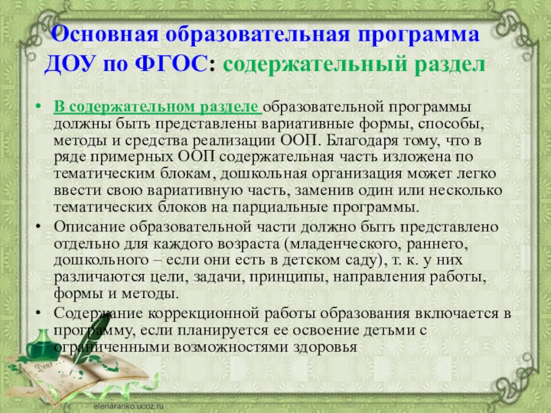 должны быть представлены вариативные формы, способы, методы и средства реализации ООП. Благодаря тому, что в ряде примерных ООП содержательная часть изложена по тематическим блокам, дошкольная организация может легко ввести свою вариативную часть, заменив один или несколько тематических блоков на парциальные программы.