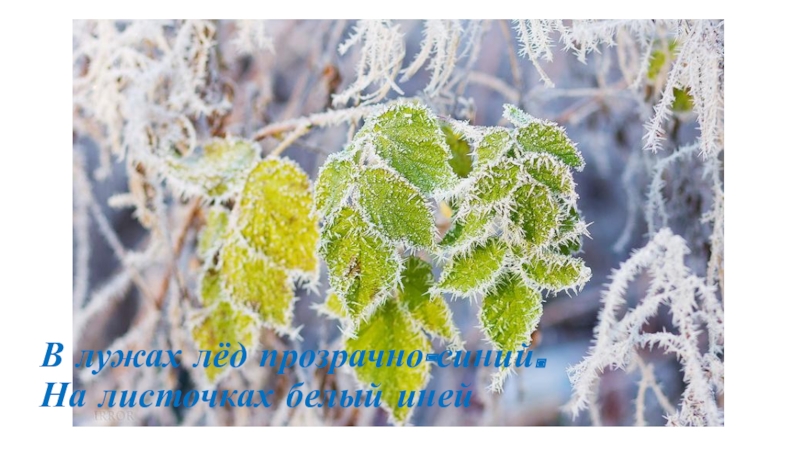 Слайд 4В лужах лёд прозрачно-синий. На листочках белый иней