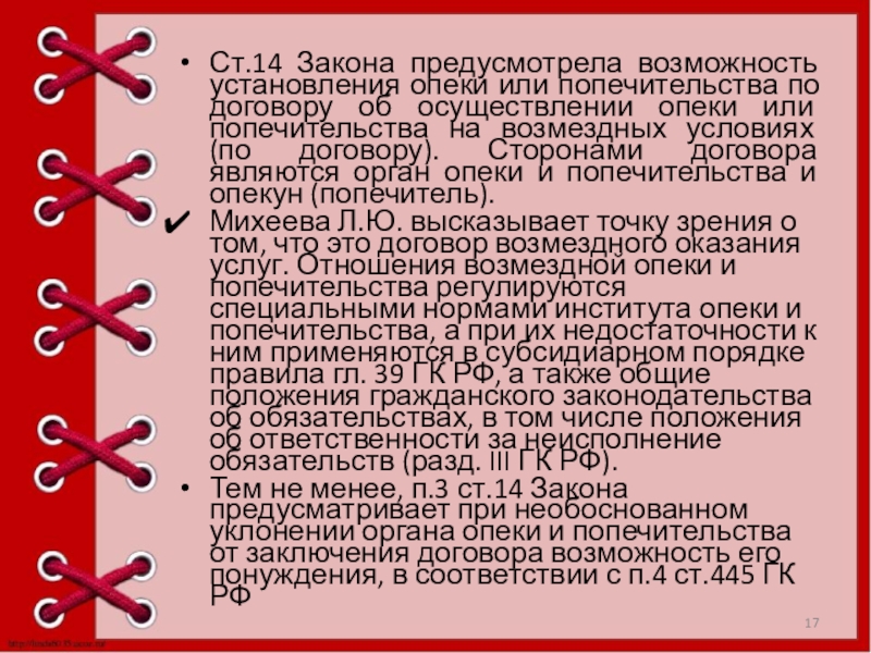 Слайд 17Ст.14 Закона предусмотрела возможность установления опеки или попечительства по договору об