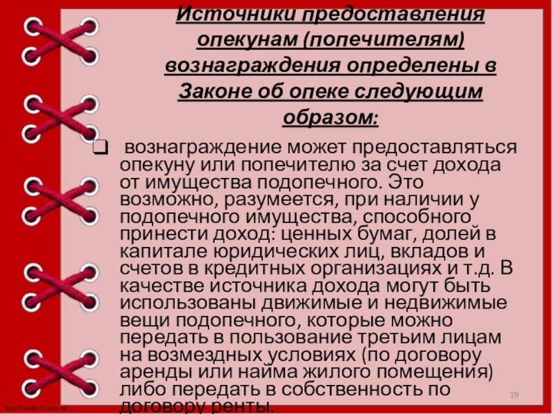 Слайд 19Источники предоставления опекунам (попечителям) вознаграждения определены в Законе об опеке следующим