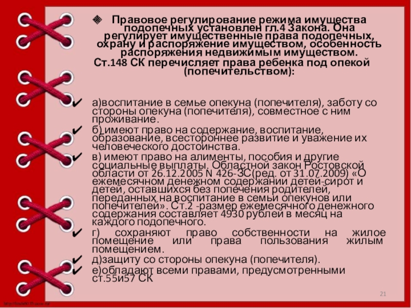 Слайд 21Правовое регулирование режима имущества подопечных установлен гл.4 Закона. Она регулирует имущественные