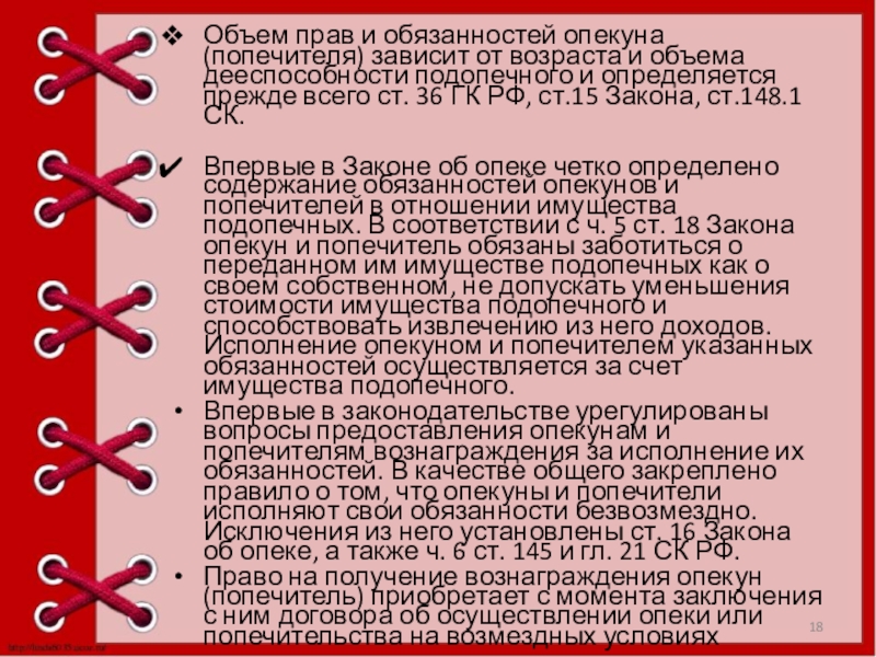 Слайд 18Объем прав и обязанностей опекуна (попечителя) зависит от возраста и объема