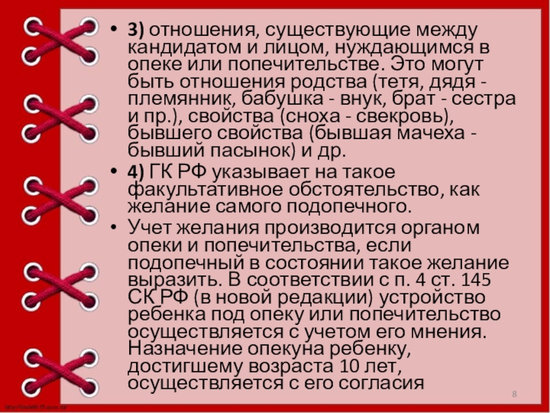 Слайд 83) отношения, существующие между кандидатом и лицом, нуждающимся в опеке или