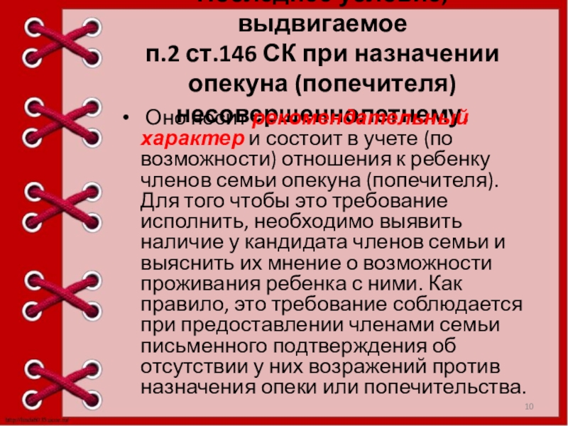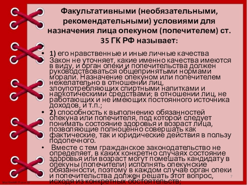 Слайд 7Факультативными (необязательными, рекомендательными) условиями для назначения лица опекуном (попечителем) ст. 35