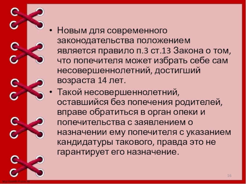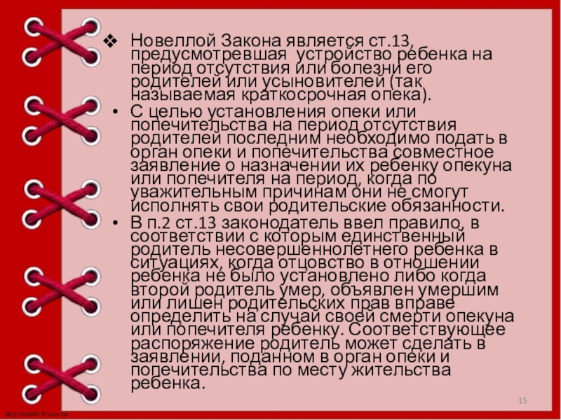 Слайд 15Новеллой Закона является ст.13, предусмотревшая устройство ребенка на период отсутствия или