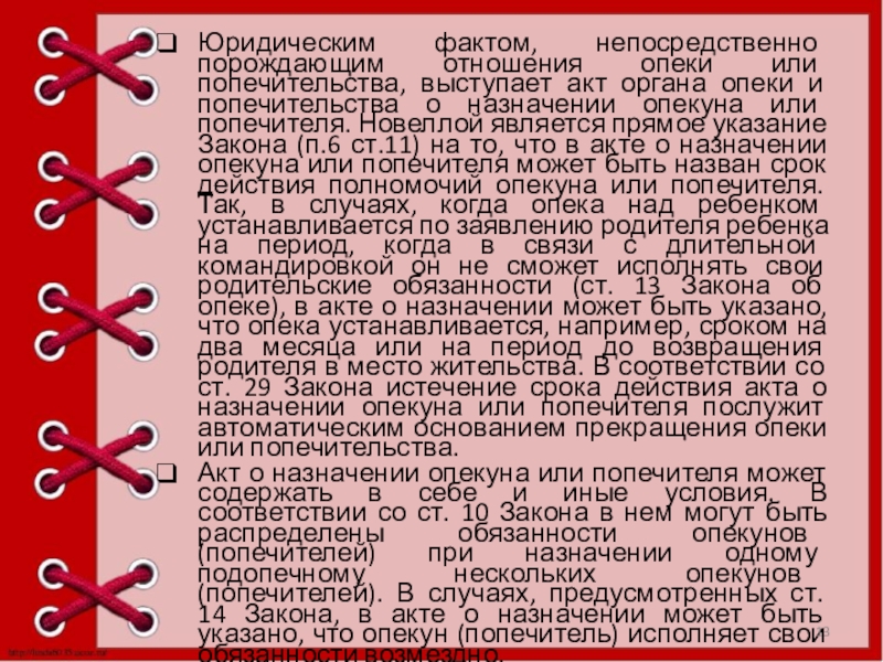 Слайд 13Юридическим фактом, непосредственно порождающим отношения опеки или попечительства, выступает акт органа