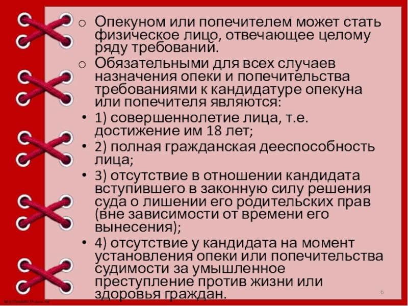 Слайд 6Опекуном или попечителем может стать физическое лицо, отвечающее целому ряду требований.