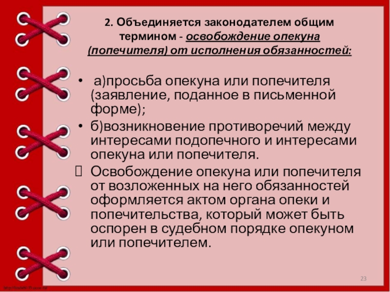 Слайд 232. Объединяется законодателем общим термином - освобождение опекуна (попечителя) от исполнения