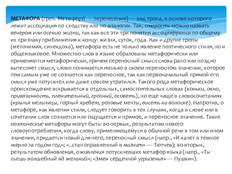 лежит ассоциация по сходству или по аналогии. Так, старость можно назвать вечером или осенью жизни, так как все эти три понятия ассоциируются по общему их признаку приближения к концу: жизни, суток, года. Как и другие тропы (метонимия, синекдоха), метафора есть не только явление поэтического стиля, но и общеязыковое. Множество слов в языке образованы метафорически или применяются метафорически, причем переносный смысл слова рано или поздно вытесняет смысл, слово понимается только в своем переносном значении, которое тем самым уже не сознается как переносное, так как первоначальный прямой его смысл уже потускнел или даже совсем утратился. Такого рода метафорическое происхождение вскрывается в отдельных, самостоятельных словах (коньки, окно, привязанность, пленительный, грозный, осоветь), но еще чаще в словосочетаниях (крылья мельницы, горный хребет, розовые мечты, висеть на волоске). Напротив, о метафоре, как явлении стиля, следует говорить в тех случаях, когда в слове или в сочетании слов сознается или ощущается и прямое, и переносное значение. Такие поэтические метафоры могут быть: во-первых, результатом нового словоупотребления, когда слову, применяющемуся в обычной речи в том или ином значении, придается новый для него, переносный смысл (напр., «И канет в темное жерло за годом год»; «..стан оправленный в магнит» — Тютчев); во-вторых, результатом обновления, оживления потускневших метафор языка (напр., «Ты пьешь волшебный яд желаний»; «Змеи сердечной угрызенья» — Пушкин).