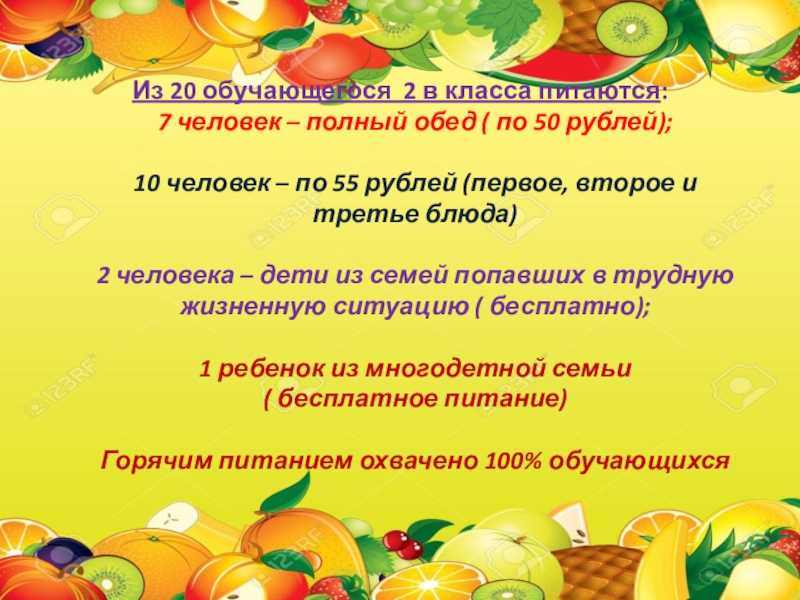 Слайд 12Из 20 обучающегося 2 в класса питаются: 7 человек – полный обед