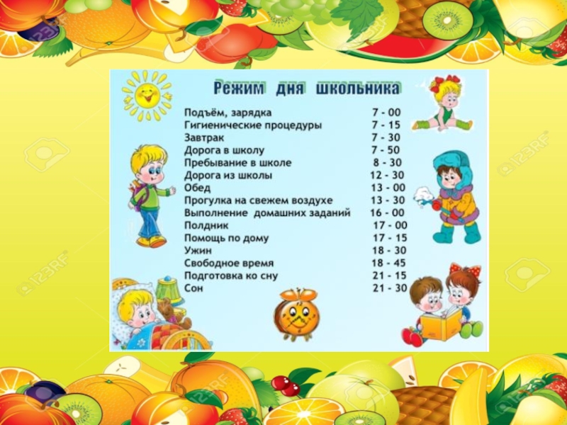 Учащиеся в первую смену в 7:00-8:00 должны получать завтрак (дома, перед уходом в школу), в 11:00-12:00 – горячий завтрак в школе, в 14:30-15:30 – после окончания занятий – обед в школе (обязательно для учащихся групп продленного дня) или дома, а в 19:00-19:30 – ужин (дома).