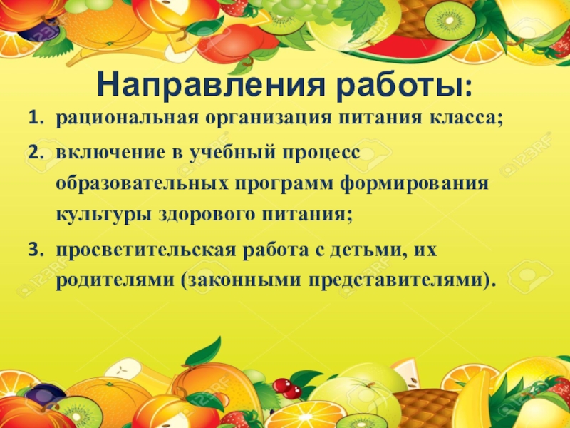 Направления работы:рациональная организация питания класса;включение в учебный процесс образовательных программ формирования культуры здорового питания; просветительская работа с