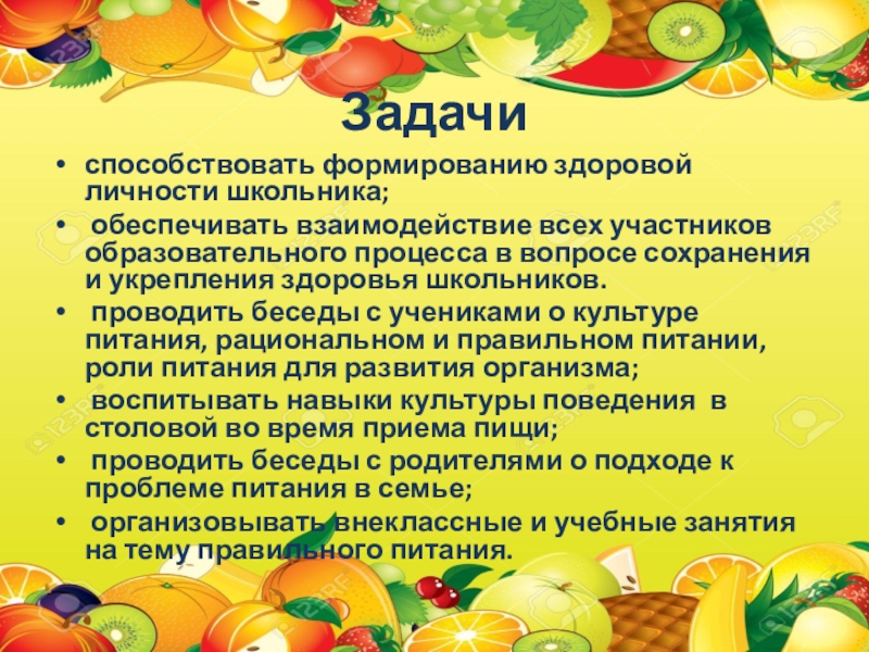 организовывать внеклассные и учебные занятия на тему правильного питания.