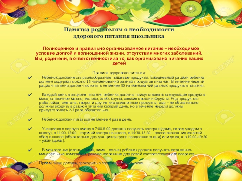Памятка родителям о необходимости  здорового питания школьника    Полноценное и правильно организованное питание –