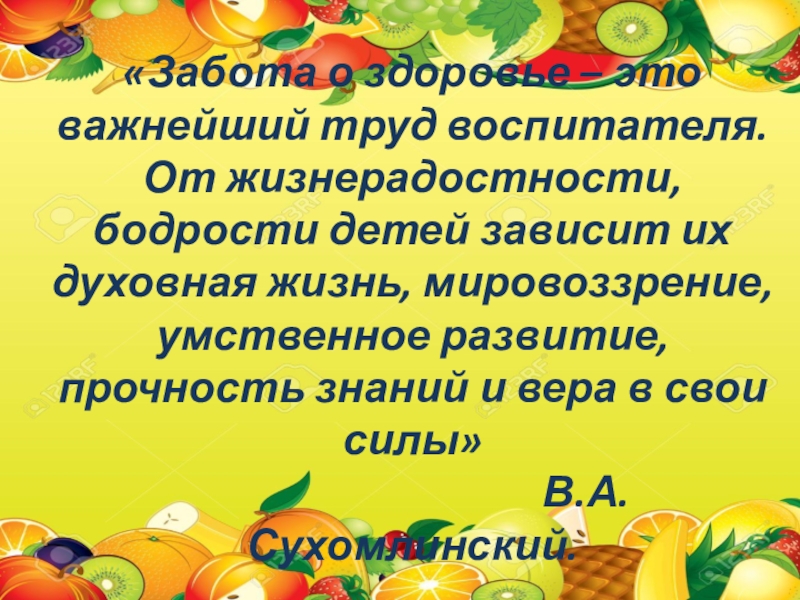 Слайд 2 «Забота о здоровье – это важнейший труд воспитателя. От жизнерадостности, бодрости