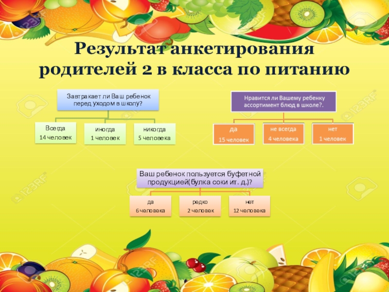 Слайд 8Результат анкетирования родителей 2 в класса по питанию