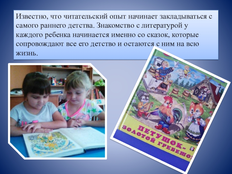 Слайд 13Известно, что читательский опыт начинает закладываться с самого раннего детства. Знакомство