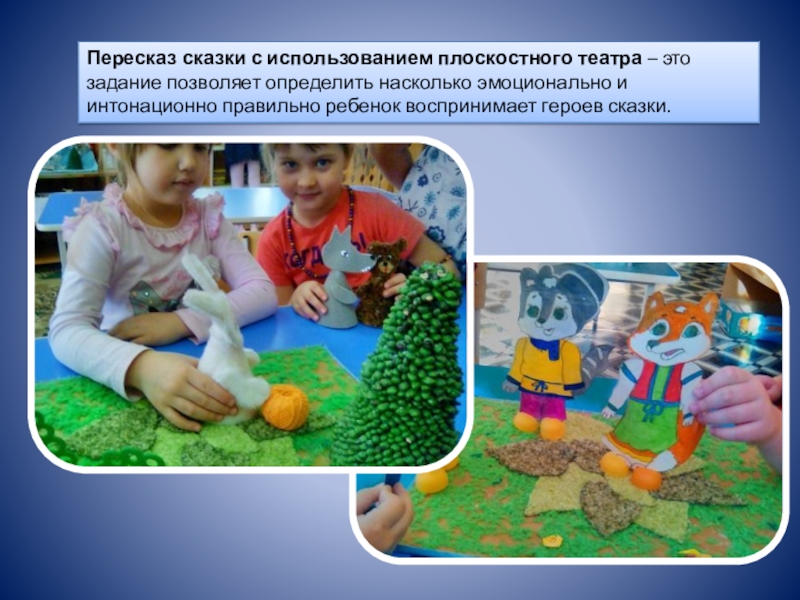 Слайд 18Пересказ сказки с использованием плоскостного театра – это задание позволяет определить насколько