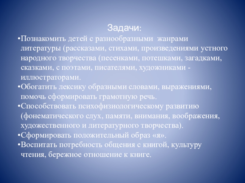 Познакомить детей с разнообразными жанрами литературы (рассказами, стихами, произведениями устного народного