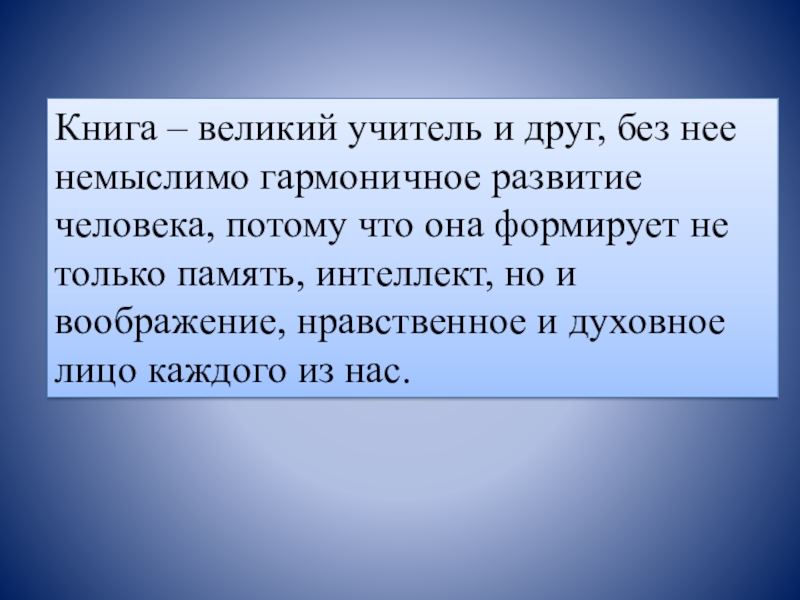 Слайд 24Книга – великий учитель и друг, без нее немыслимо гармоничное развитие