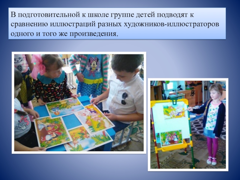 Слайд 12В подготовительной к школе группе детей подводят к сравнению иллюстраций разных