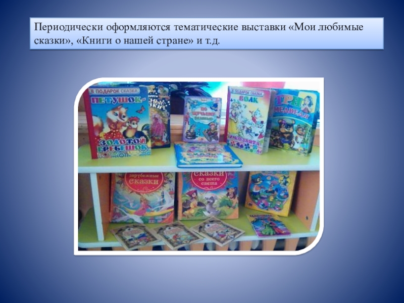 Слайд 16Периодически оформляются тематические выставки «Мои любимые сказки», «Книги о нашей стране»