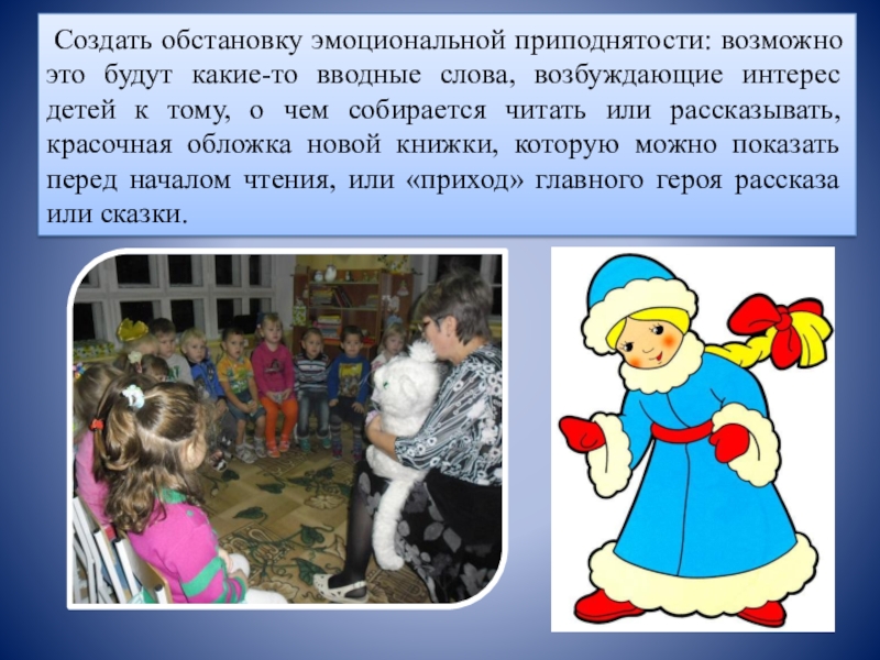 возбуждающие интерес детей к тому, о чем собирается читать или рассказывать, красочная обложка новой книжки, которую можно показать перед началом чтения, или «приход» главного героя рассказа или сказки.