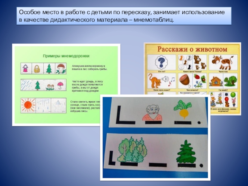 Слайд 19Особое место в работе с детьми по пересказу, занимает использование в